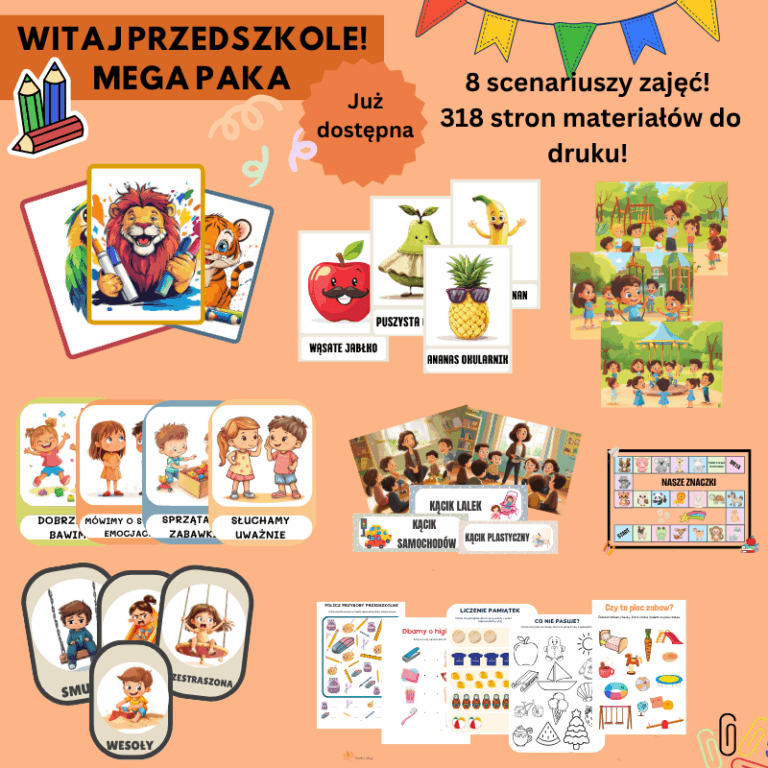Mega paczka zawiera komplet scenariuszy i materiałów do przeprowadzenia zajęć w tematyce rozpoczęcia lub powrotu do przedszkola. Zawiera aż 8 scenariuszy o następujących tytułach: Nasze przedszkolne zabawki Dbamy o higienę Pierwszy dzień w przedszkolu – zabawy integracyjne Moja droga do przedszkola Nasz plac zabaw Wspominamy wakacje Przybory przedszkolne Nasze przedszkolne zasady Każdy scenariusz zawiera mnóstwo…