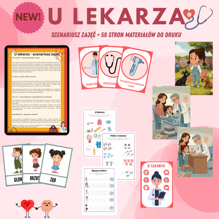 U lekarza to gotowy scenariusz zajęć dla przedszkolaków z materiałami do druku. Do pliku dołączonych zostało, aż 56 stron materiałów do zabaw.🥼🩺 Co dokładnie znajdziesz w scenariuszu pt. U lekarza? Zabawę wprowadzającą do zajęć pt. Co mnie boli? Plakat i ilustrację do rozmowy na temat wizyty u lekarza Zabawę dydaktyczną z wykorzystaniem…