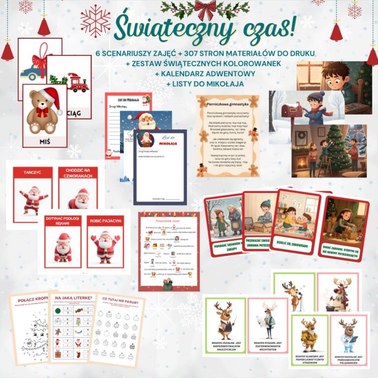 Mega paczka pt. Świąteczny czas zawiera: 6 świątecznych scenariuszy zajęć 307 stron A4 materiałów do samodzielnego wydruku 21 kolorowanek świątecznych Kalendarz adwentowy w postaci listów od Świętego Mikołaja do dzieci na każdy dzień. W listach znajdują się zadania i zagadki dla dzieci Szczegółowy opis paczki: Świąteczne scenariusze zajęć zawierają następujące tematy: 1. Idzie Mikołaj…