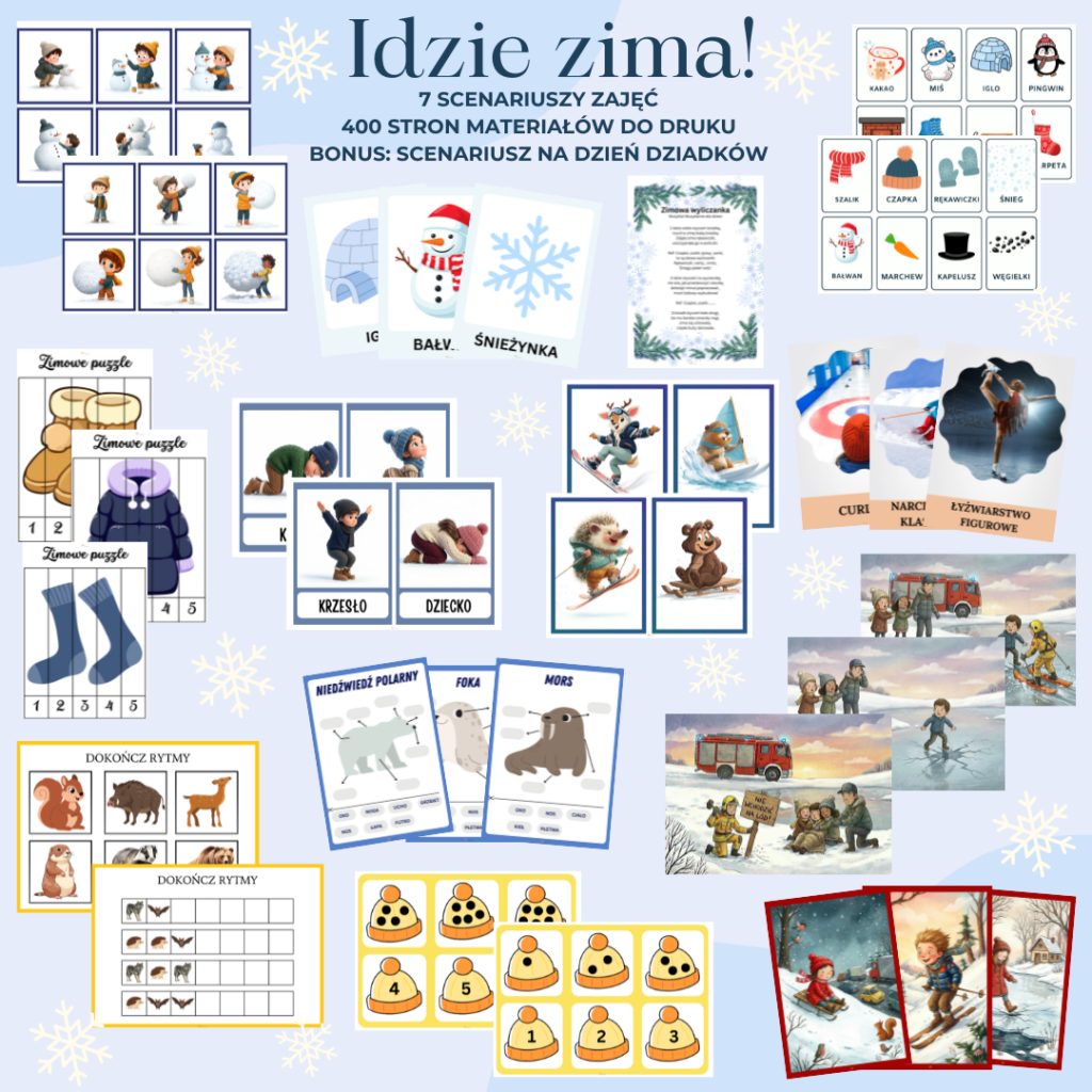 Jeśli ten wpis Ci się przydał, to pokochasz moją Megapakę „Idzie Zima”! Przygotowałam tam ponad 450 stron materiałów, w tym 7 kompletnych scenariuszy zajęć (o śniegu, zwierzętach, sportach zimowych) i gotowy pakiet na Dzień Babci i Dziadka. 👵👴 Nie trać czasu na szukanie – pobierz wszystko w jednej paczce!